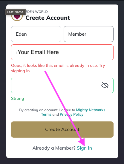 STEP 2: If you put in your name and email and it says: "Oops, it looks like this email is already in use. Try signing in."